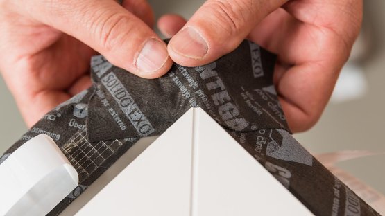 Laisser dépasser CONTEGA SOLIDO EXO-D d’env. 2 cm dans le coin (longueur de la diagonale du coin de la fente) et le coller sous forme de pli en coin.