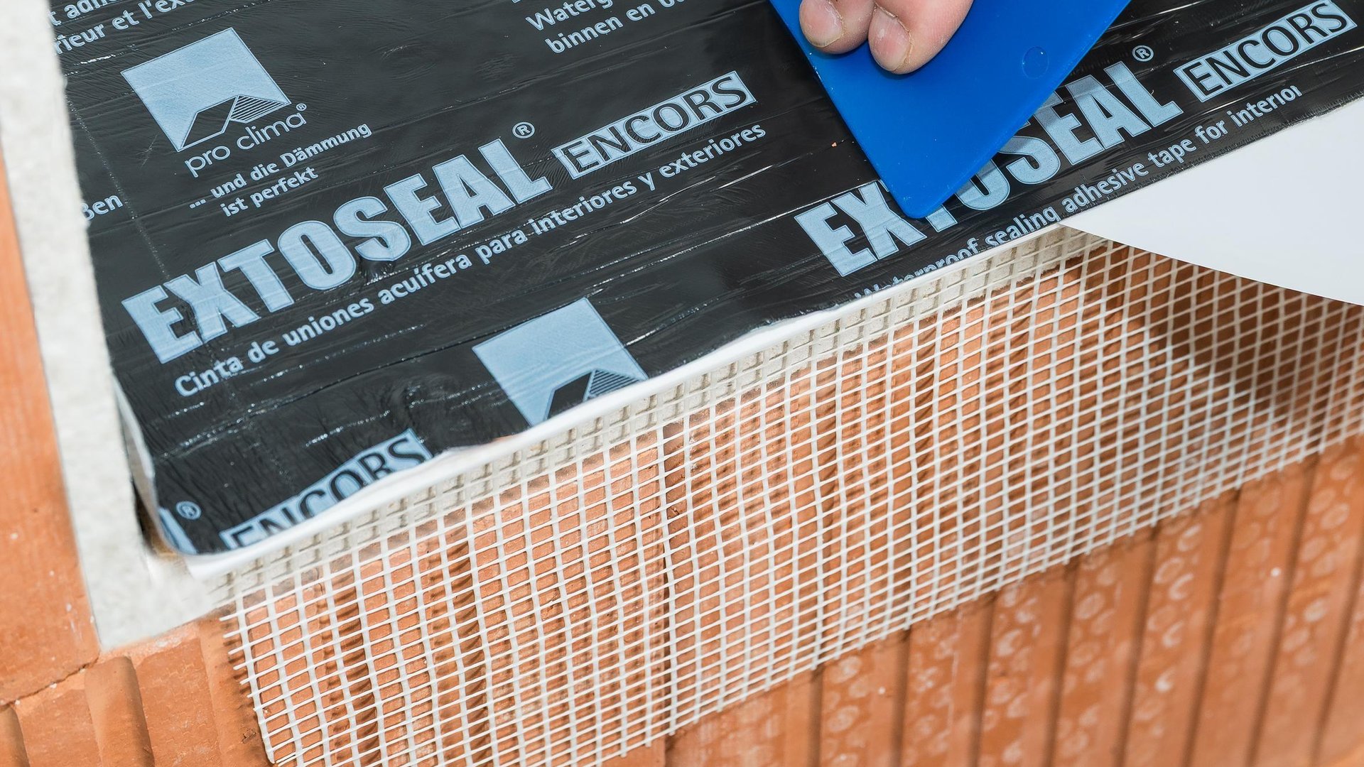 Collez EXTOSEAL ENCORS sur la surface, au moins jusqu’au bord intérieur du profilé de fenêtre, si nécessaire sur toute l’épaisseur de l’élément.