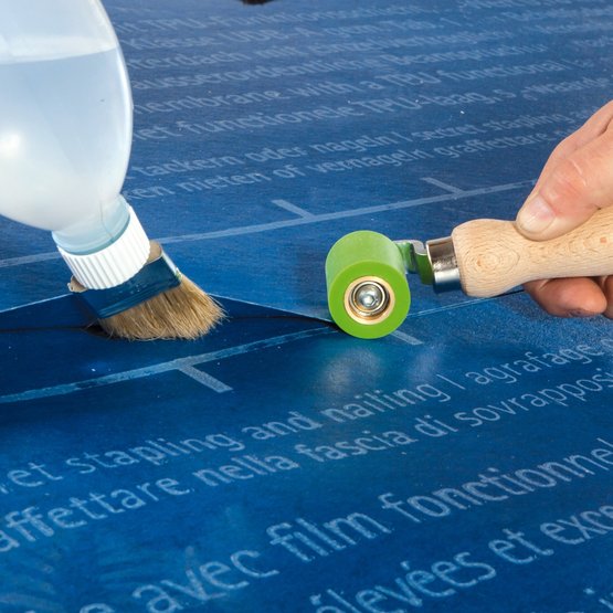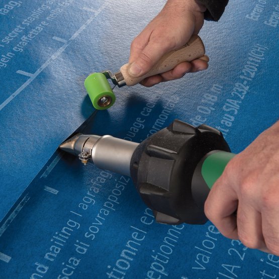 Outil pratique pour exercer une pression uniforme sur le joint soudé entre deux écrans de sous-toiture SOLITEX WELDANO.