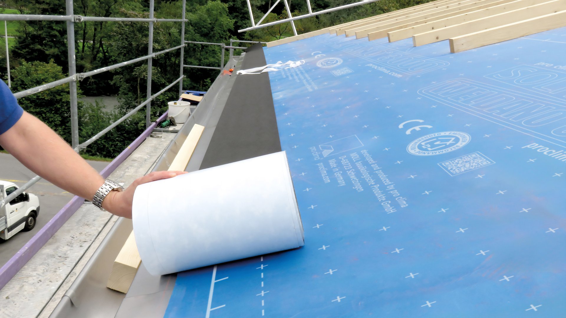 Nettoyer la tôle de gouttière et coller le bord inférieur de la membrane de sous-toiture SOLITEX WELDANO 3000 avec ORCON CLASSIC.