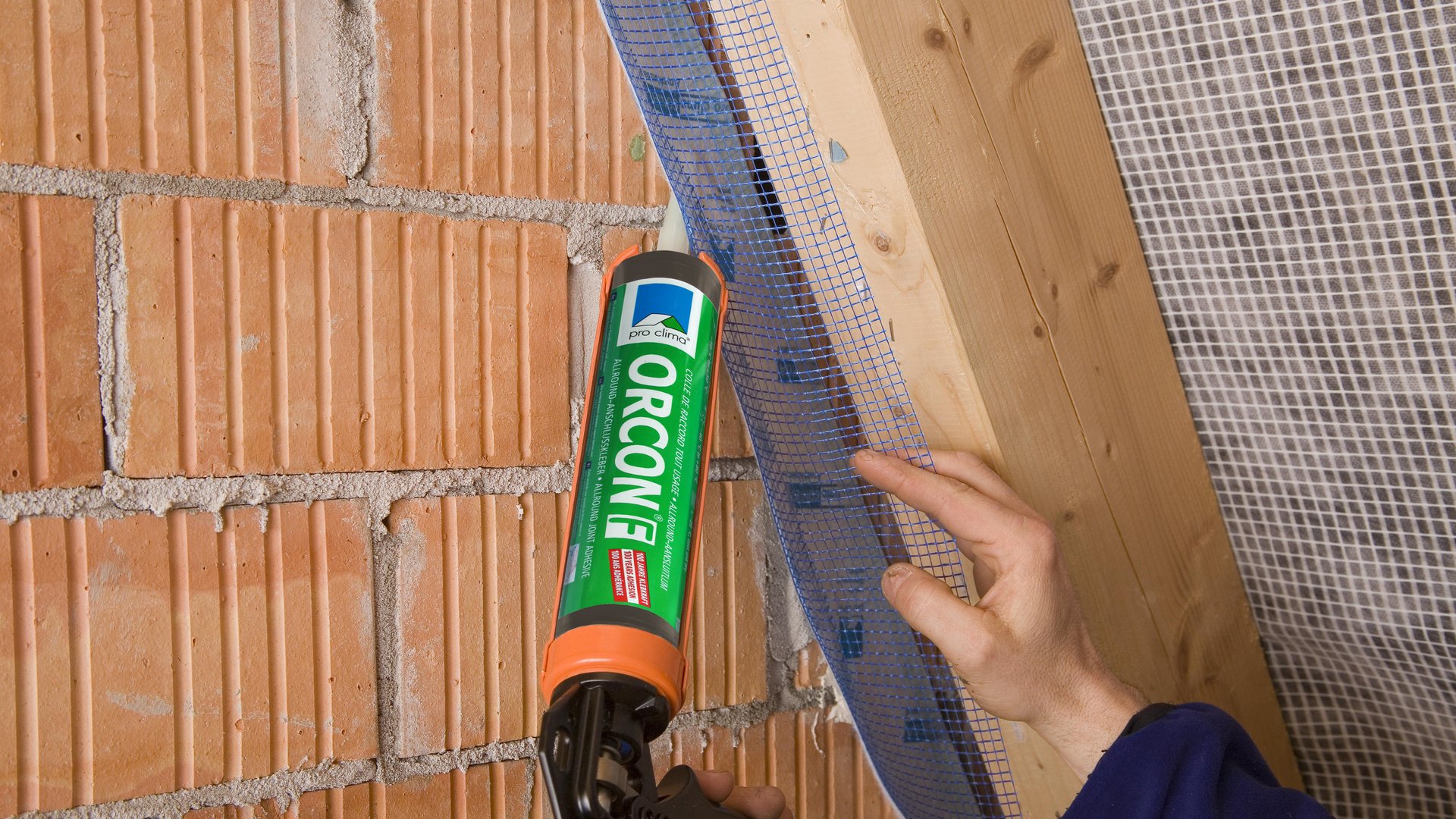 Préfixer ponctuellement le ruban de raccord d’enduit CONTEGA PV au mur, à l’aide de la colle ORCON F.